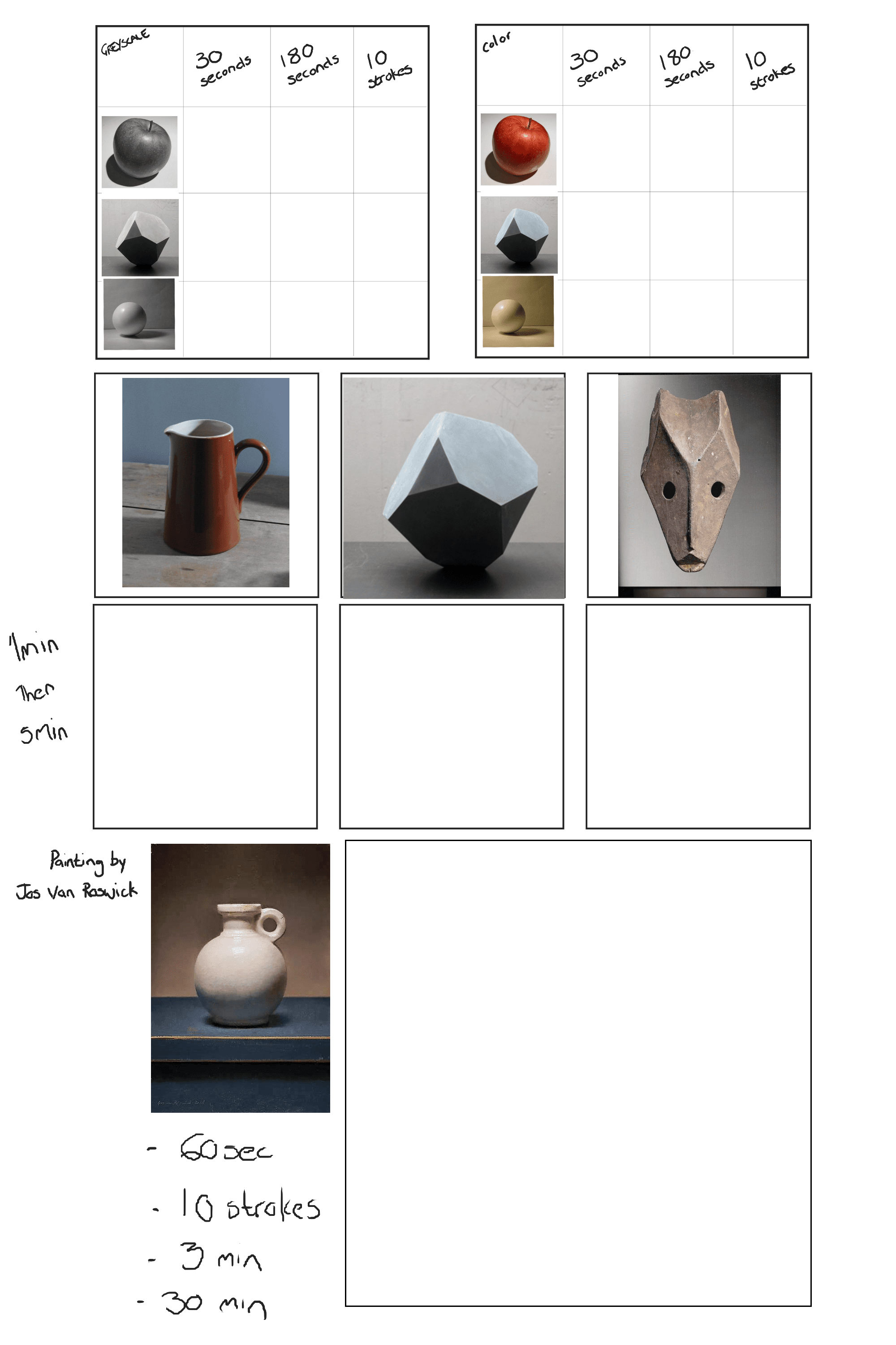 Then a quick value study, quick color study, a 3 min painting and then full 30minutes of the same subject.