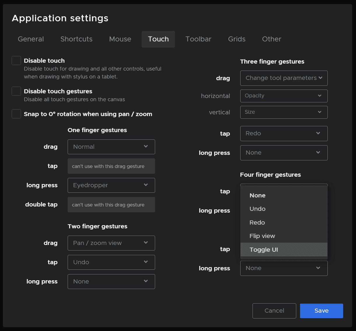 Magma has a range of touch gestures that you can adjust, going up to 5-finger tap and press. Some of the standard ones include two-finger double tap to undo, two-finger pinch/drag to zoom or rotate and pan the canvas, and a four-finger tap to hide the Magma UI.