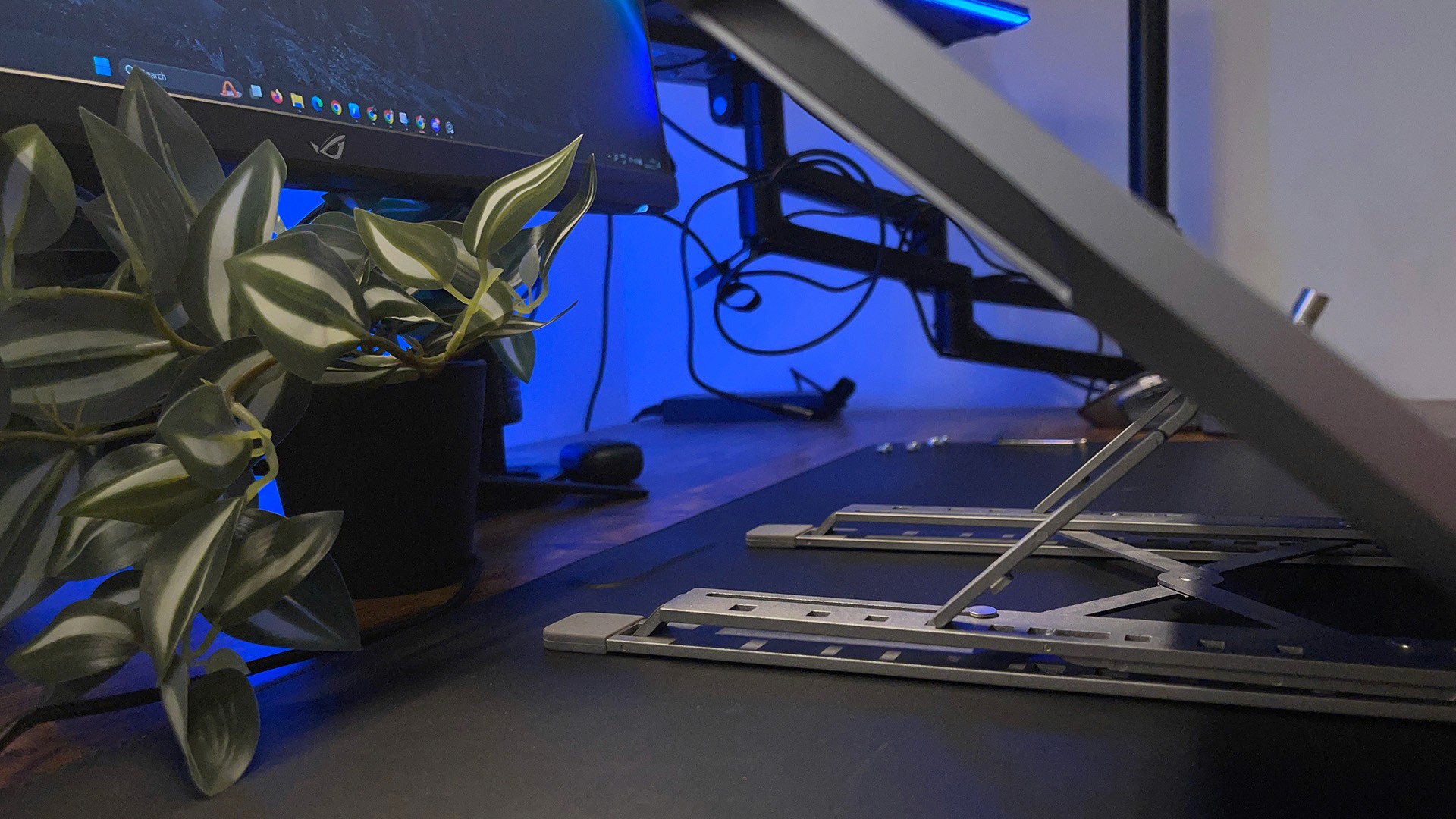 It has both foldable feet and VESA holes on the back to mount on monitor arm to suit different setups.
