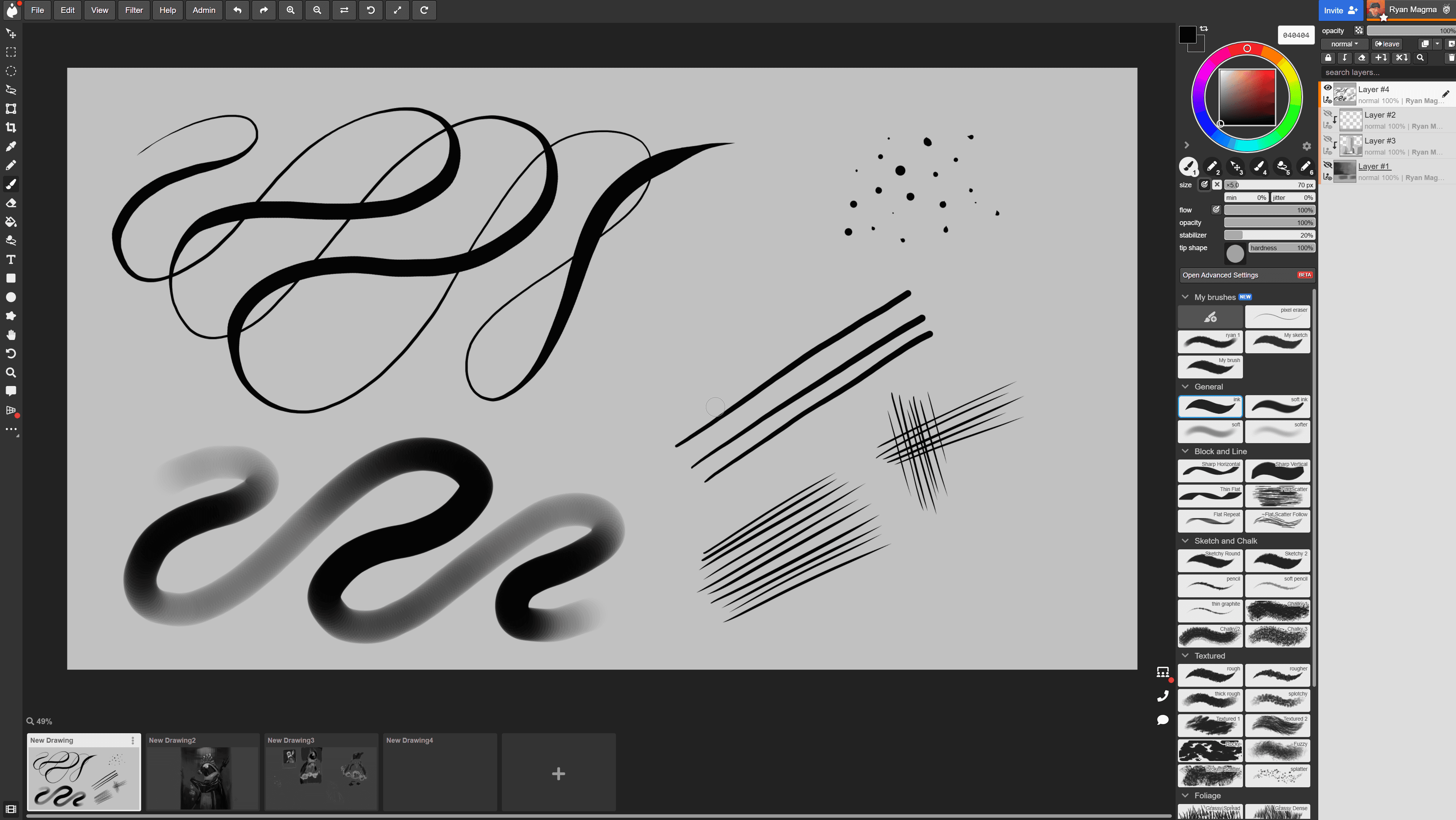This means that when I have a large brush size with the pressure setting on, I can make both very light or very thin lines and thick or heavy ones without needing to adjust my settings much. The pressure response is fantastic. Drawing lines from thin to thick and back to thin was easy to control.