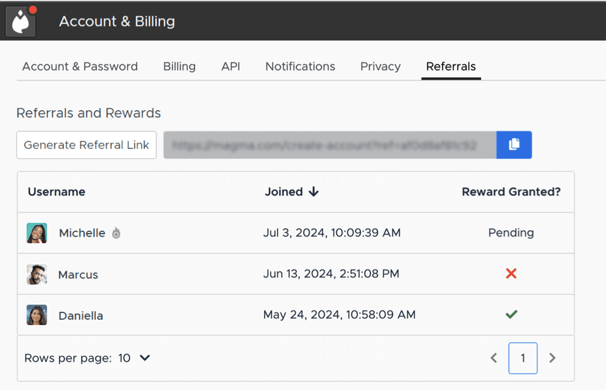 Click “Generate Referral Link” to get a referral link unique to your account, and click the blue “Copy” icon to copy it onto your clipboard. From here, feel free to share your link and invite new friends to draw with you!