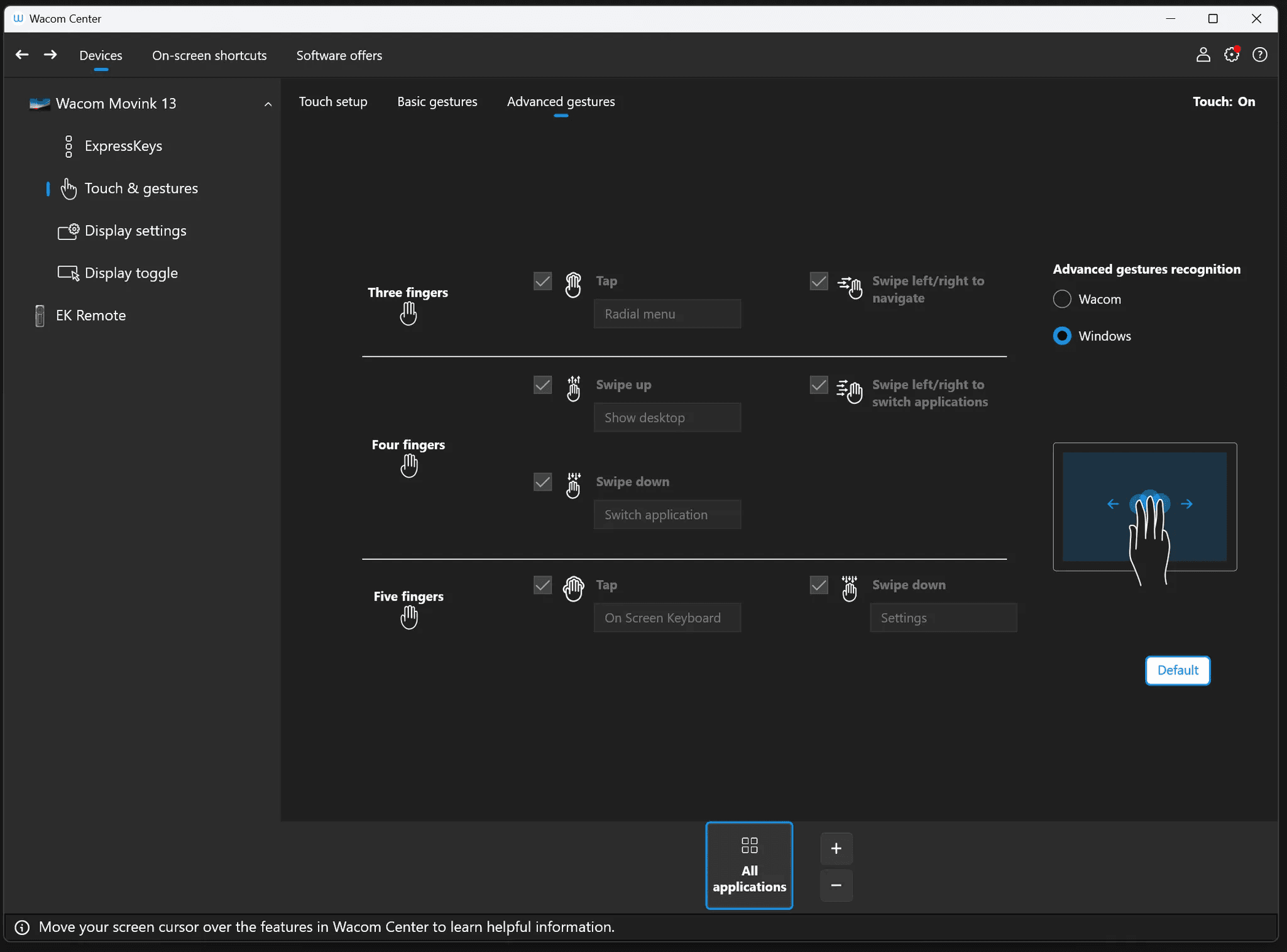 Touch Gestures and On-Screen Menues in Magma with the Wacom Movink